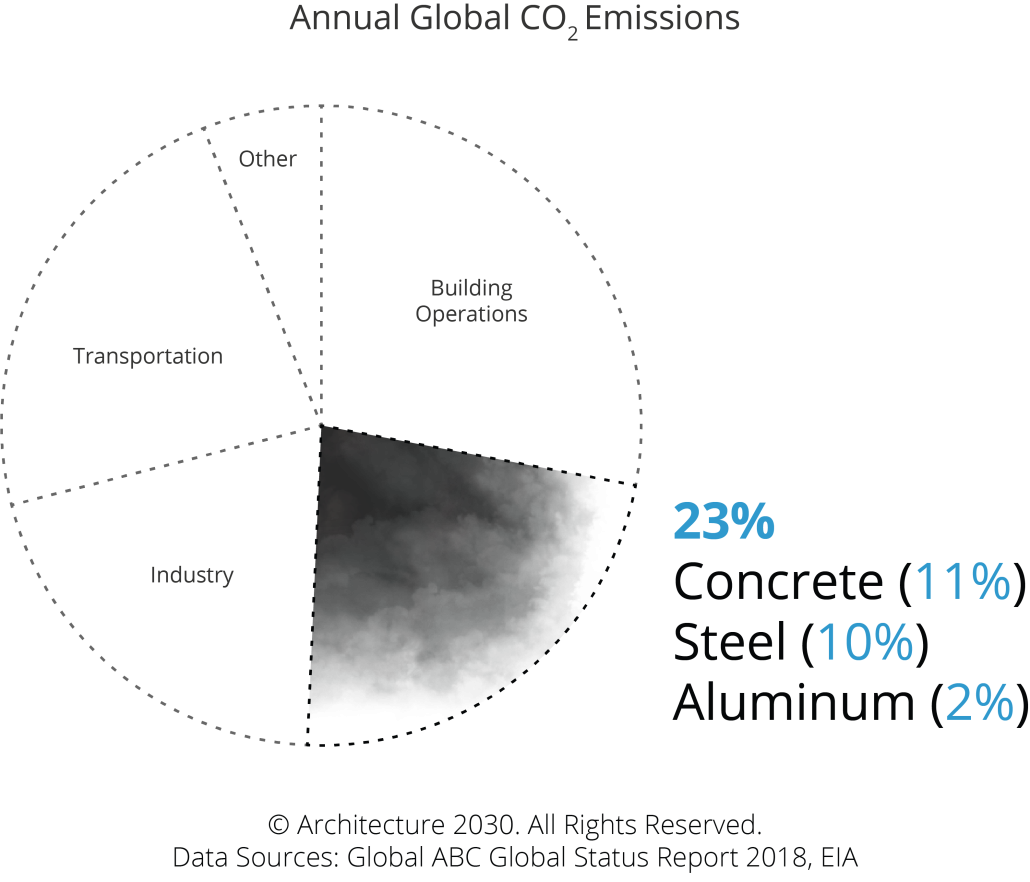 Of those total emissions, building operations are responsible for 27% annually, while building and infrastructure materials and construction (typically referred to as embodied carbon) are responsible for an additional 13% annually.