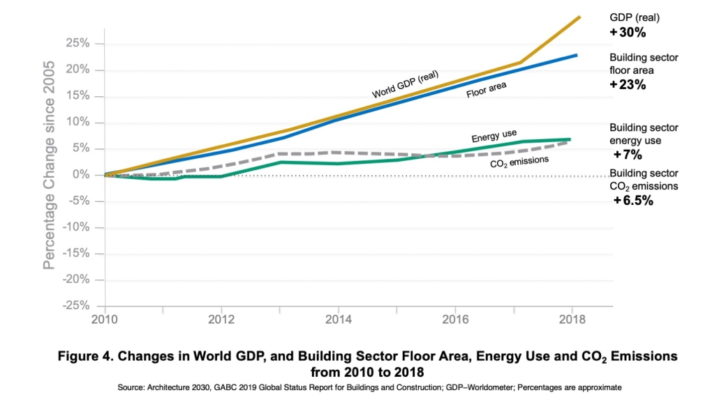 While global GDP and building sector floor area increased 30% and 23% respectively from 2010 to 2018, world building sector energy use increased by only 7% and building sector emissions by 6.5%. Building sector emissions have been relatively flat since 2013, even though global building floor area increased by approximately 376 billion square feet during this period.