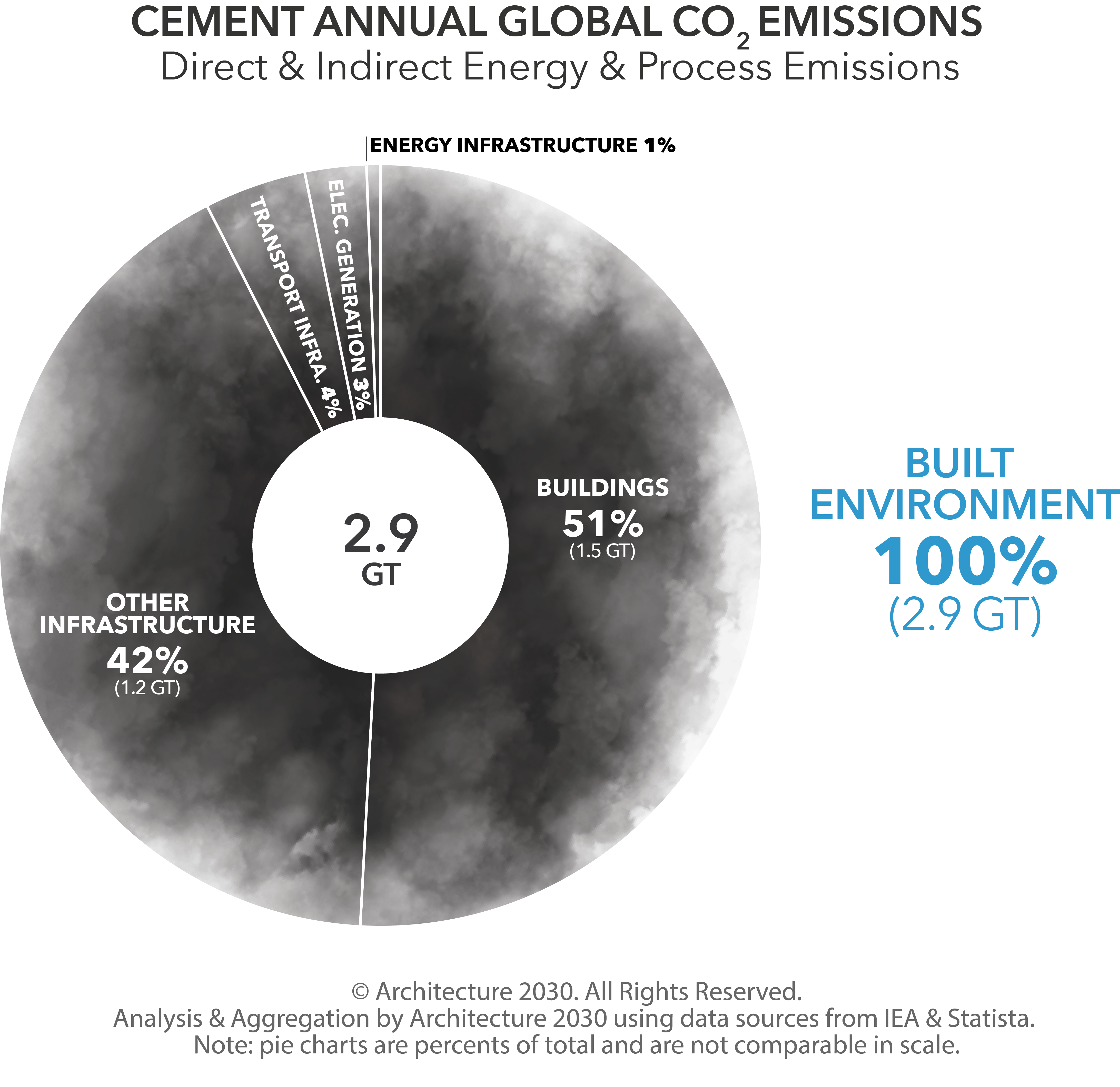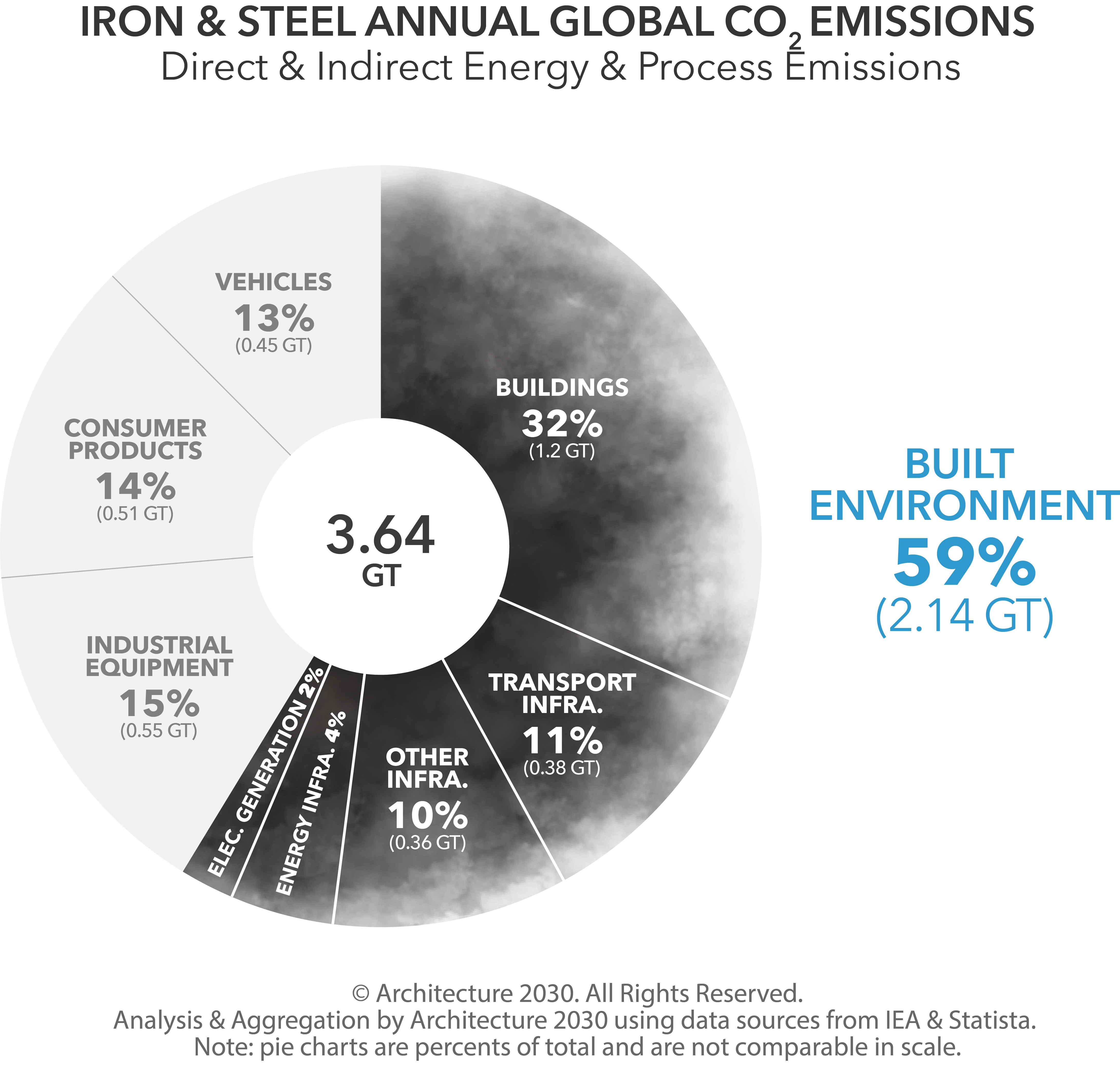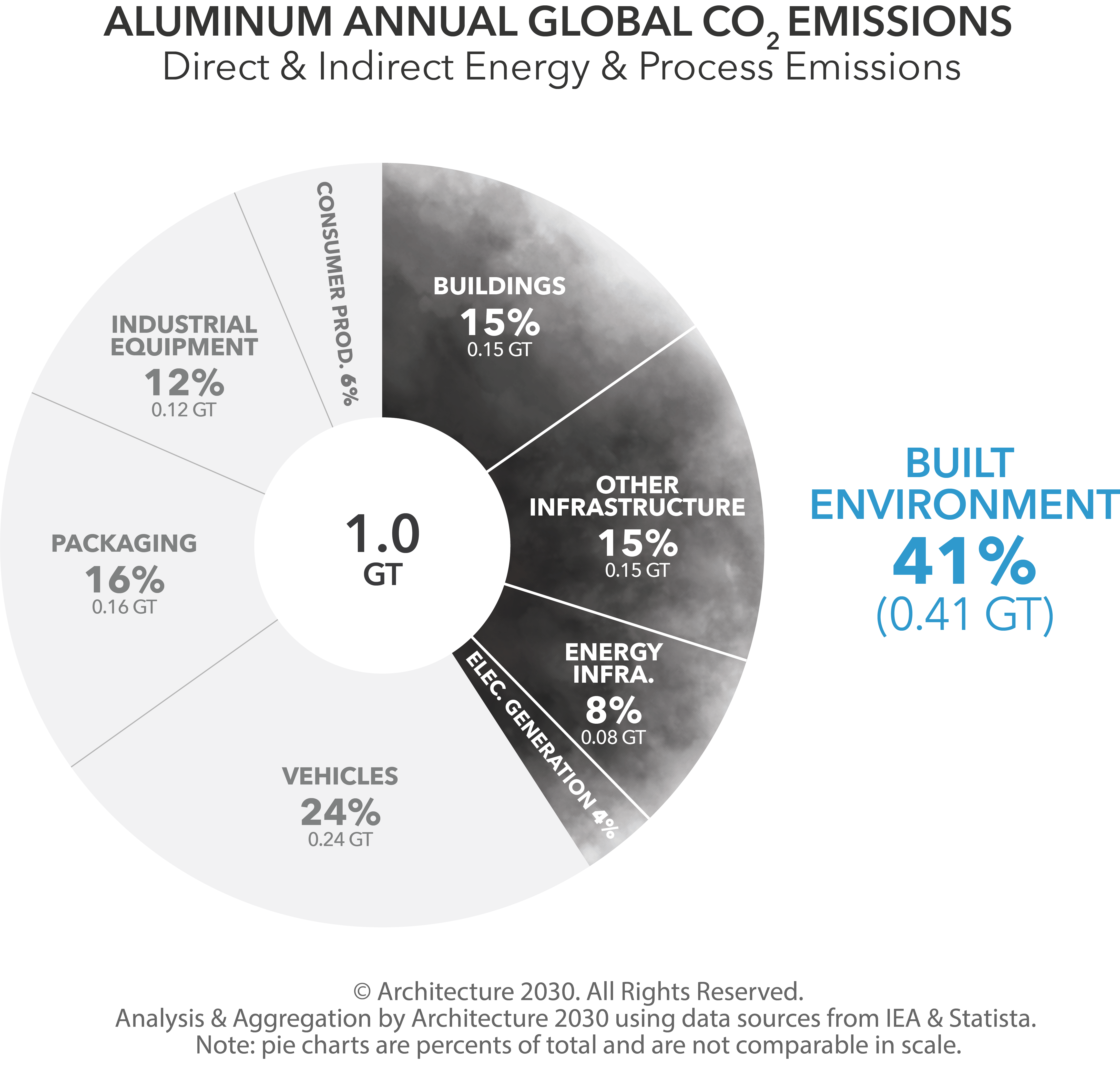 Of those total emissions, building operations are responsible for approximately 27% annually, while the embodied carbon of just four building and infrastructure materials – cement, iron, steel, and aluminum – are responsible for an additional 15% annually.