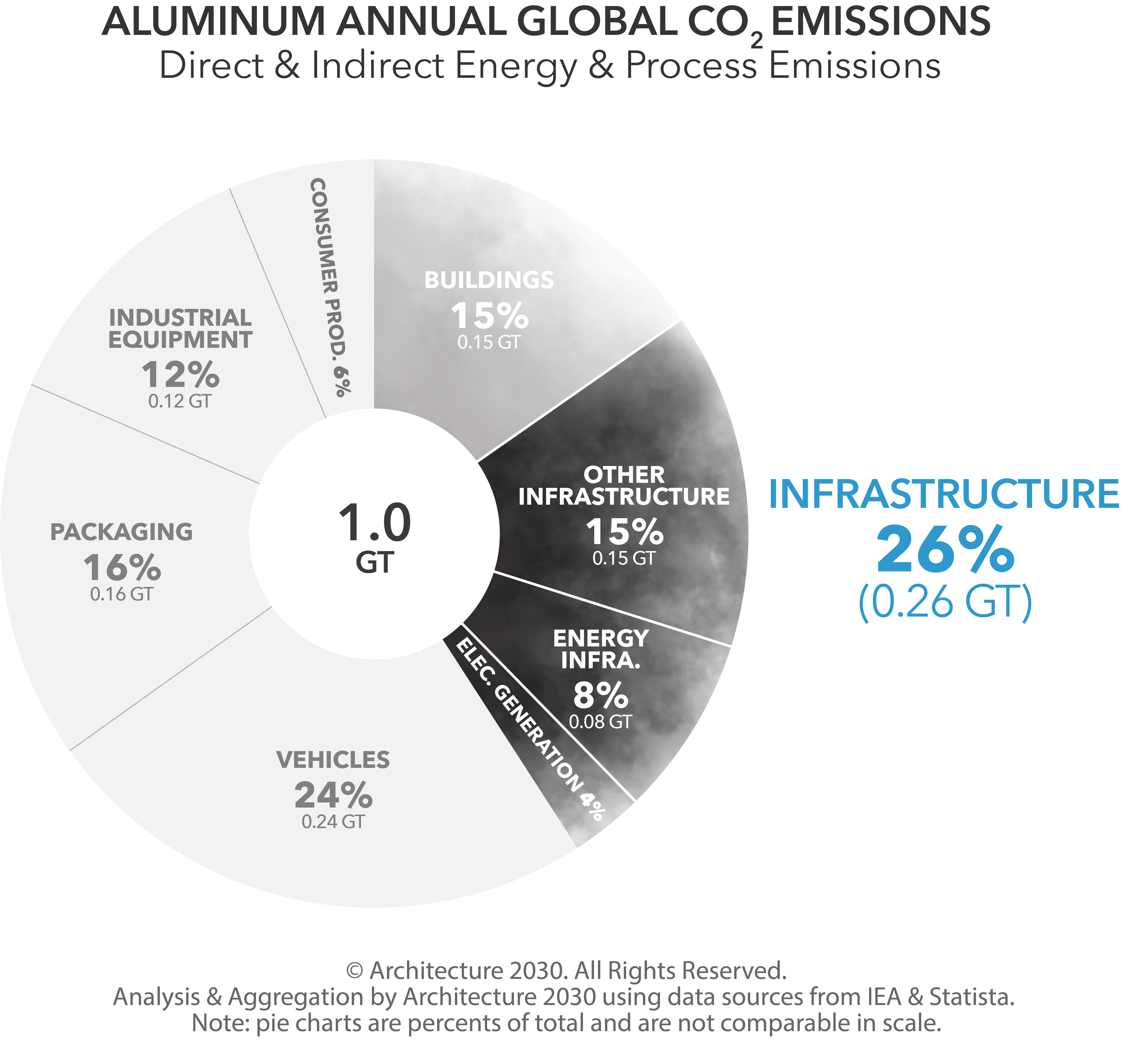 Of those total emissions, cement emissions for infrastructure are responsible for approximately 3.9% annually, while steel, iron and aluminum emissions for infrastructure are for responsible for an additional 3.4% annually.